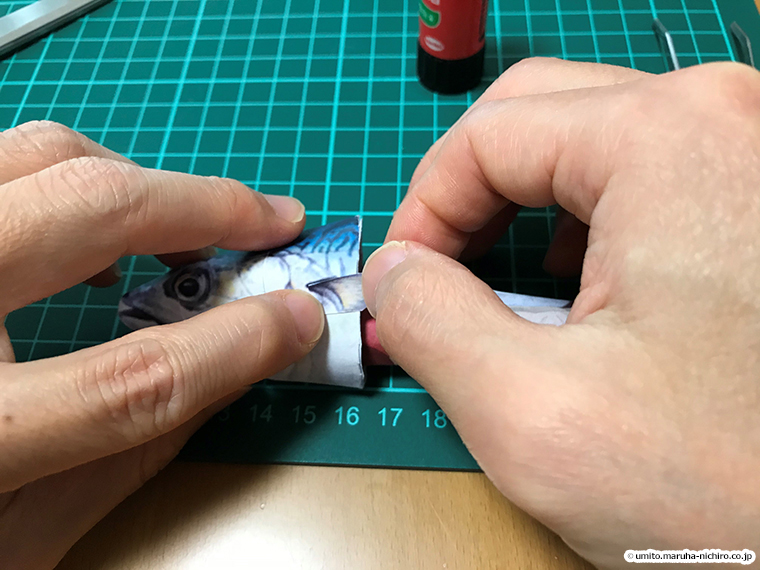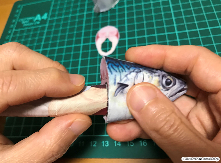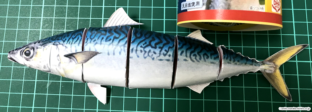 このペーパークラフトはマサバ1尾の姿を細部まで忠実に再現するだけでなく、工作を通して、マサバの体のつくりを学べる内容になっています。組み立てたマサバは、付属の“缶詰型ボックス”に切り身パーツを入れることで、「月花さば水煮缶」の完成イメージを再現できます。