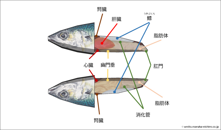 胃…サバは大食漢で、成魚になるとカタクチイワシなどを丸ごと飲み込み、胃や腸で消化吸収します。サンマなど胃のない魚と異なり食べたものが内臓に残っています。また、雑菌やアニサキスなど寄生虫がいることも多いので、サバの内臓は食べられません。