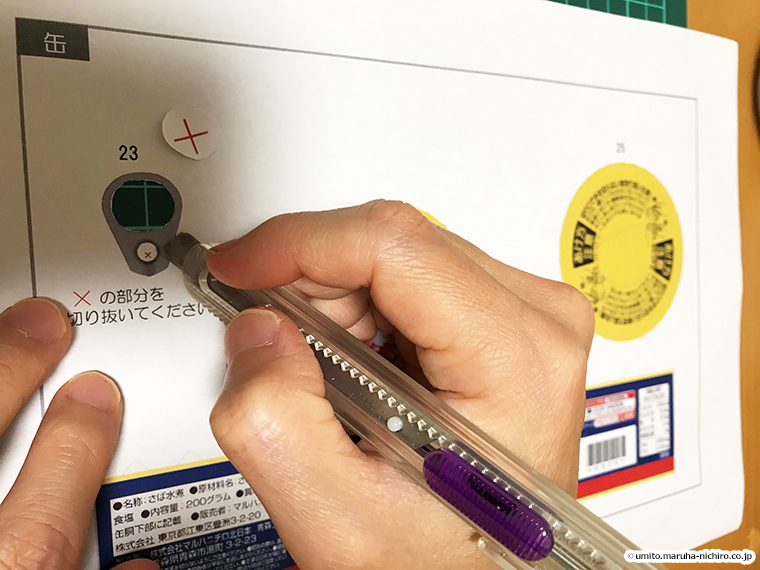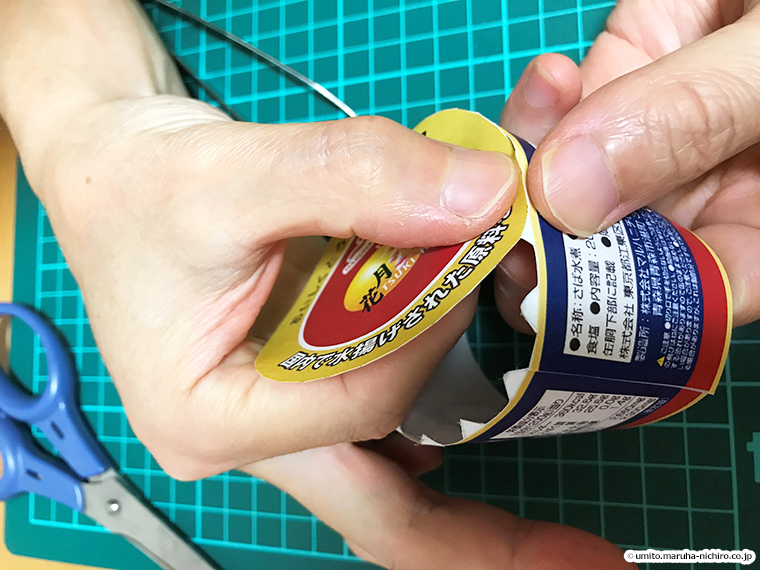 切り抜いた缶詰は筒状に糊付けしてから天面を付けます。