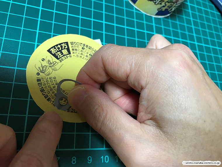 プルトップはのりしろの反対の位置に小さな丸の部分くらいまで糊付けします。