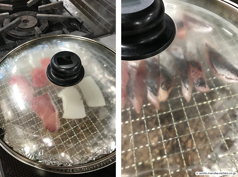動画ではフタにボウルを用いていますが、スモークするものの厚さが薄い場合は、取っ手の付いているフライパンのフタのほうが扱いやすいでしょう。しかし、平らなフタは煙が循環しにくく、また、切り身がフタにくっついてしまう恐れがあるので、高さのあるフタの利用をおすすめします。