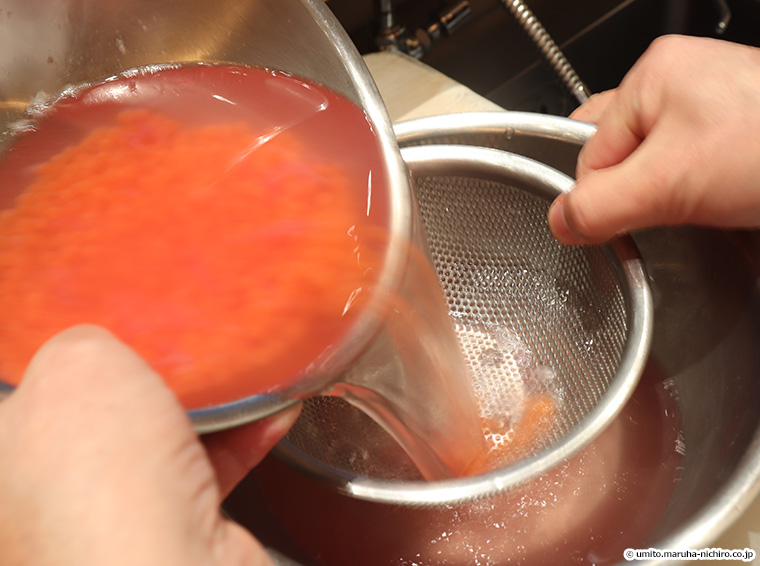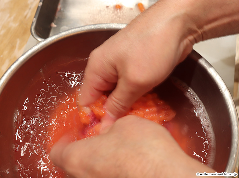 1.1.5%程度の塩水の中で、筋子の皮を卵からやさしく外していく