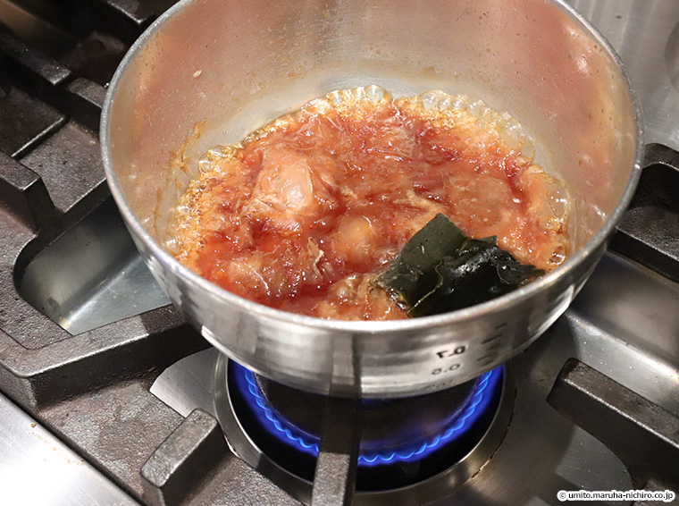 1.調味液(漬け地)を作る。薄口醤油50cc、酒10cc、5cm角に切った昆布1枚を鍋に入れ、ひと煮立ちさせたら鰹節5gを加え、濾して冷ます