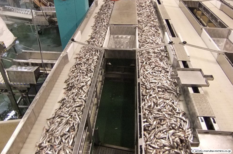 上の写真はノルウェーでの生産現場。1時間に50トンのシシャモががオスとメスに選別されていきます。