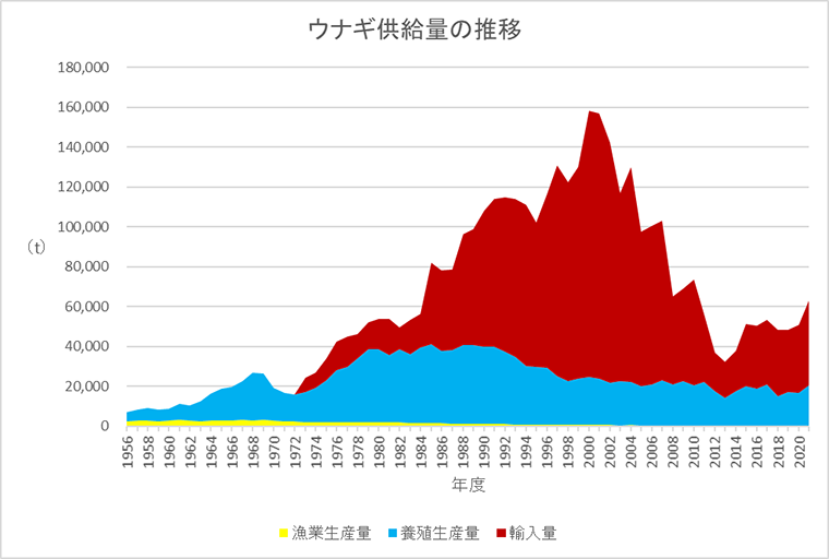 減少が心配されているウナギですが、国内供給量自体は1980年代後半ごろから輸入によって増加しています。最も多かった年は2000年で、約16万トンが供給されました。その後は減少し、現在は約6万トン程度です。なお、天然ウナギの漁業生産量は全体の0.1%なので、私たちが食べているウナギはほぼ養殖と輸入で賄われています。