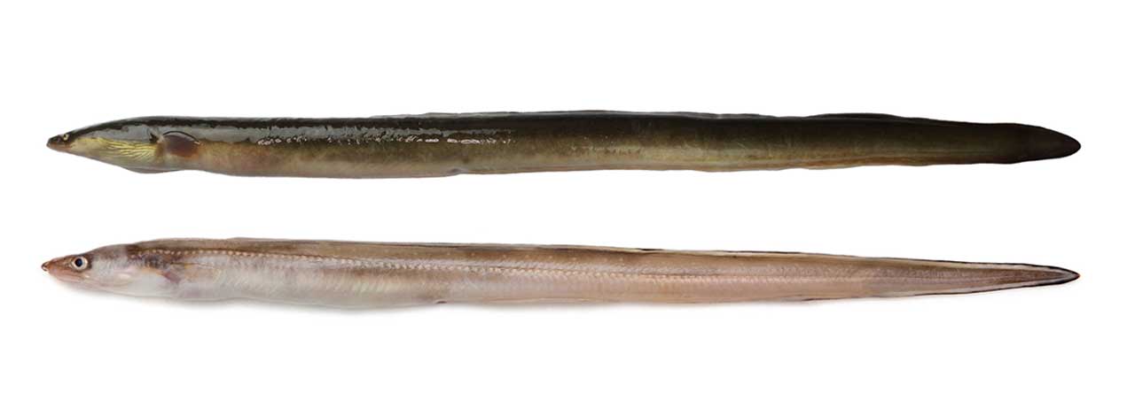 アナゴ類はウナギと同様に、細長い円筒形で腹びれがなく、背びれ、尻びれと尾びれが連続しているのが特徴です。