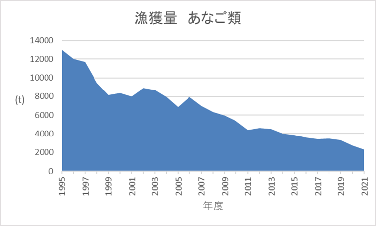 Umios(旧マルハニチロ)にて作成) ※あなご類漁獲量は2021年度のみ速報値)
