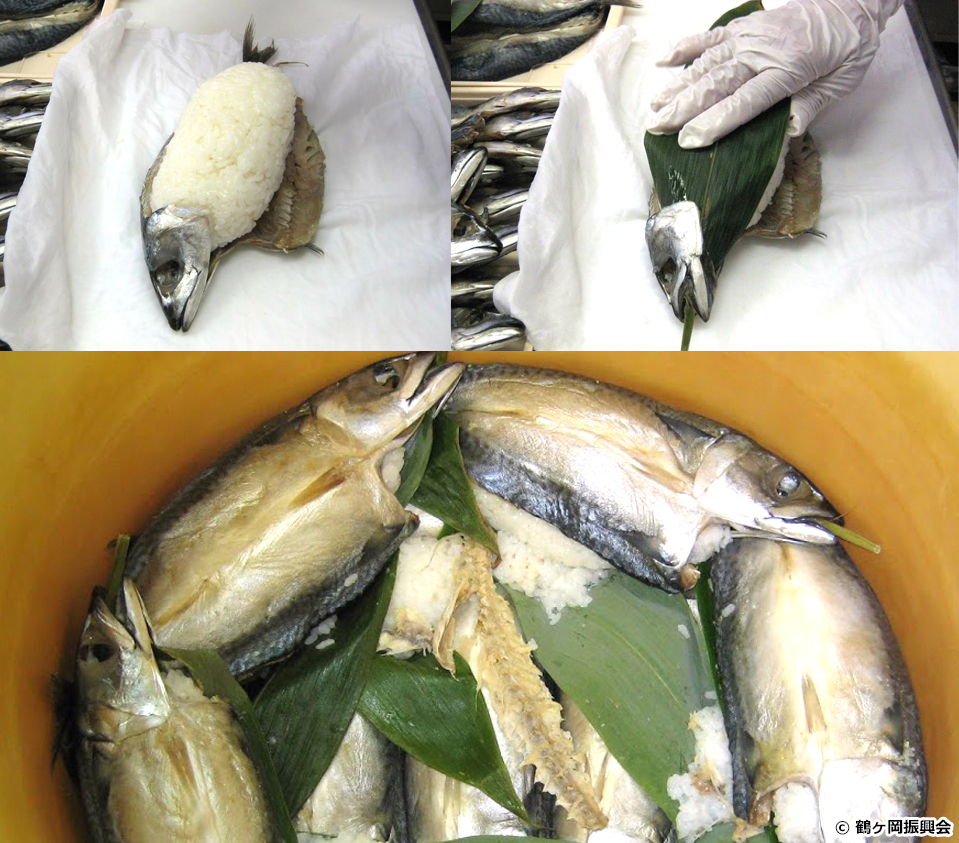 300年以上の歴史をもつ行事食は、塩漬けの鯖にご飯を詰めて桶に入れ、重しをして水あるいは塩水を張り、約1週間かけて発酵させたもの。チーズのようなふくよかな香り、濃厚な風味が楽しめます。