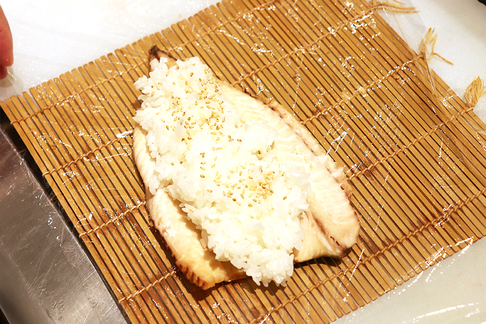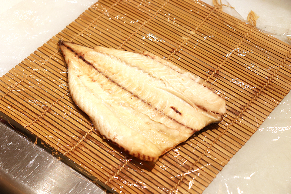 巻きすにラップを敷き、サバの塩焼きは皮目を下にして開いておく。