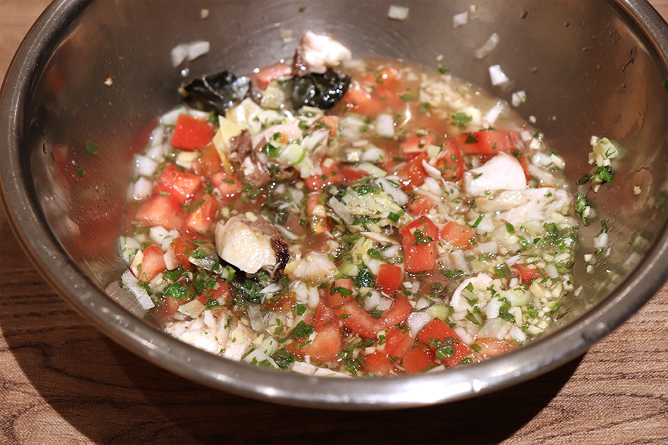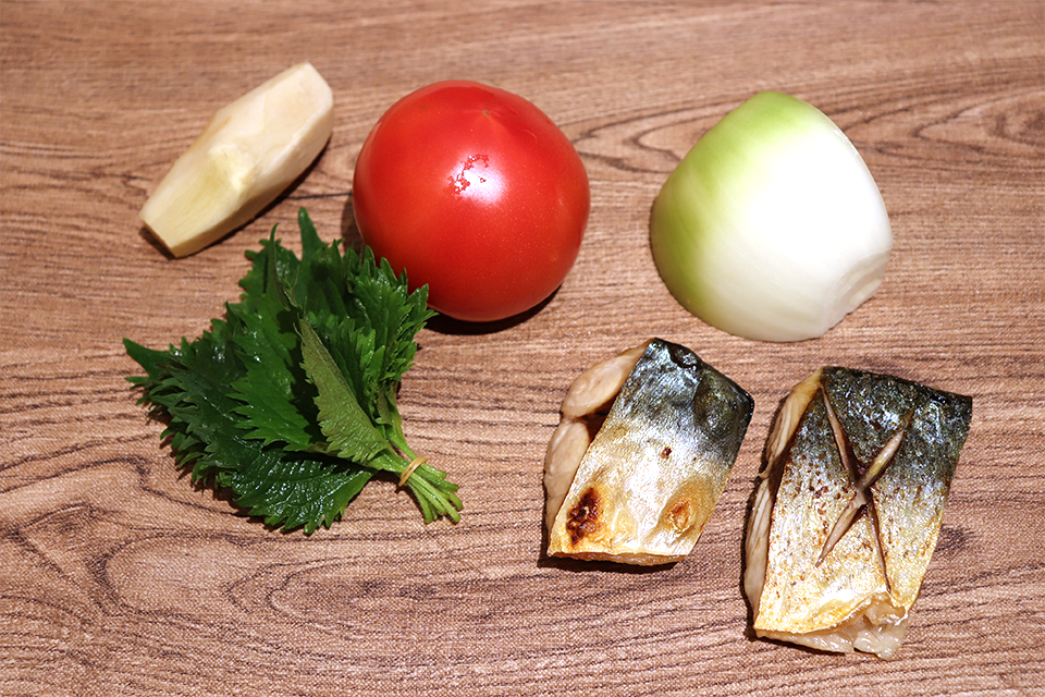 サバの塩焼きは2㎝の角切り、トマトは湯むきして小角に切り、玉ネギ、大葉、生姜は粗みじん切りにする。