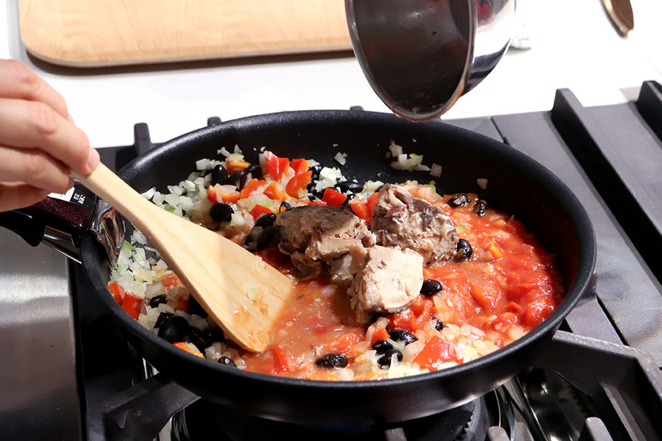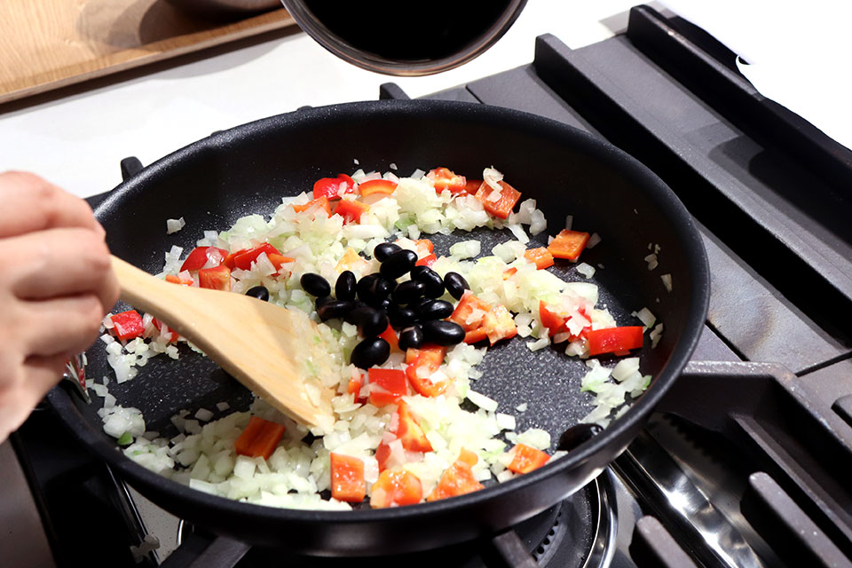 フライパンにオリーブ油を熱し、にんにくを炒めて香りが出たら玉ねぎ、パプリカ、黒豆も加えて炒める。