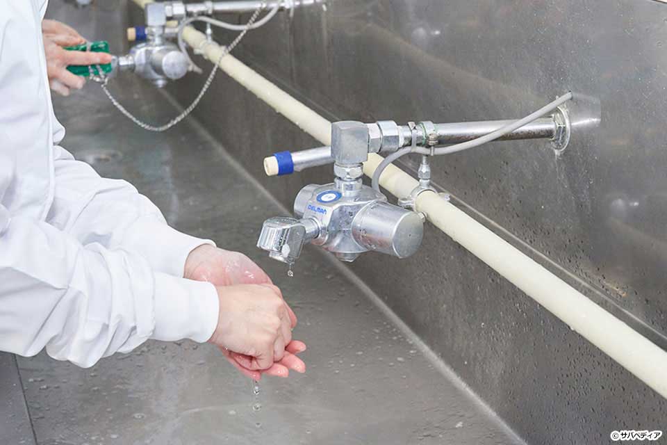 缶詰は人の口に入るものです。そのため作業する人は、缶詰を作るときだけでなく、工場の中に入る前から、異物や菌が入らないよう、細心の注意を払っています。