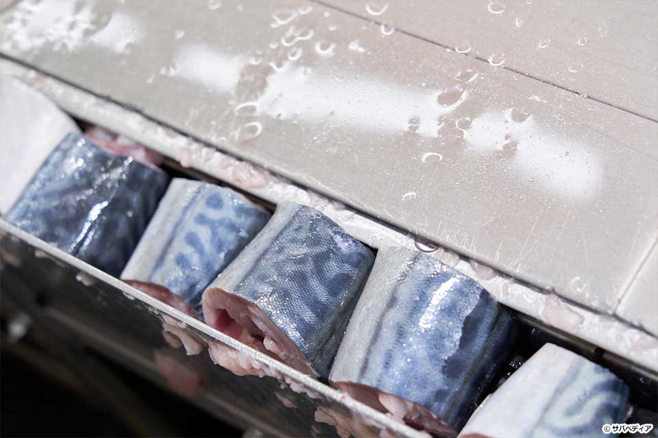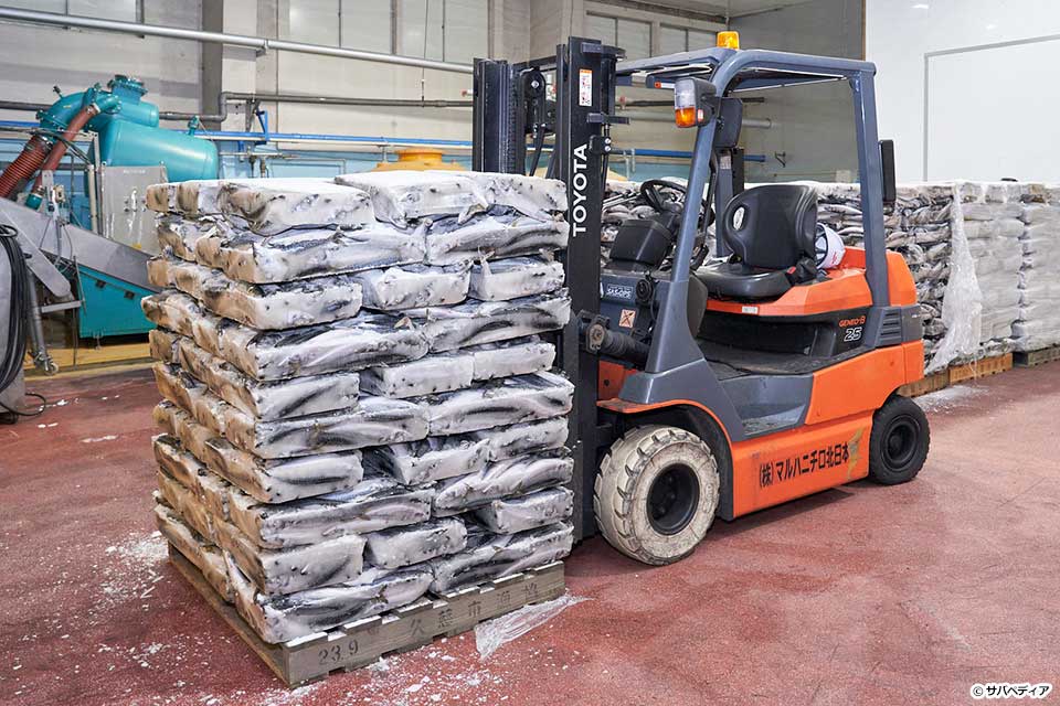 サバが獲れる秋~冬は、港から直接工場へ生のままサバが来ますが、それ以外の時期は、一旦生のままブロック状に冷凍して倉庫に保管しておき、必要な分を工場に運びます。