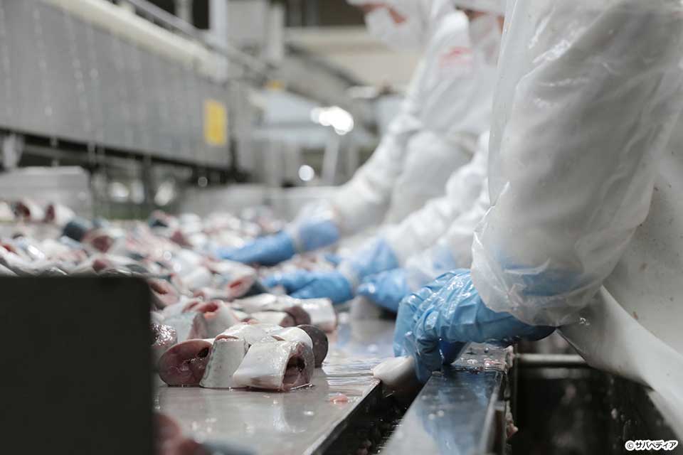 サバを缶詰に加工するとき、頭や尾、内蔵などは切り落とし、缶詰には入れません。 だからといって切り落とした部分を廃棄せず、養殖マグロのエサなどに利用され、無駄なく活用しています。