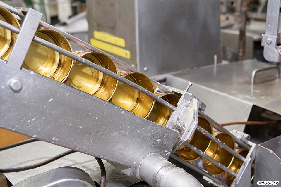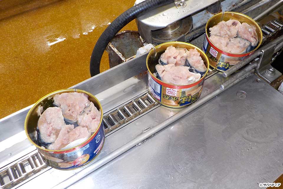ベルトコンベアは、サバを缶に入れる機械へつながっています。