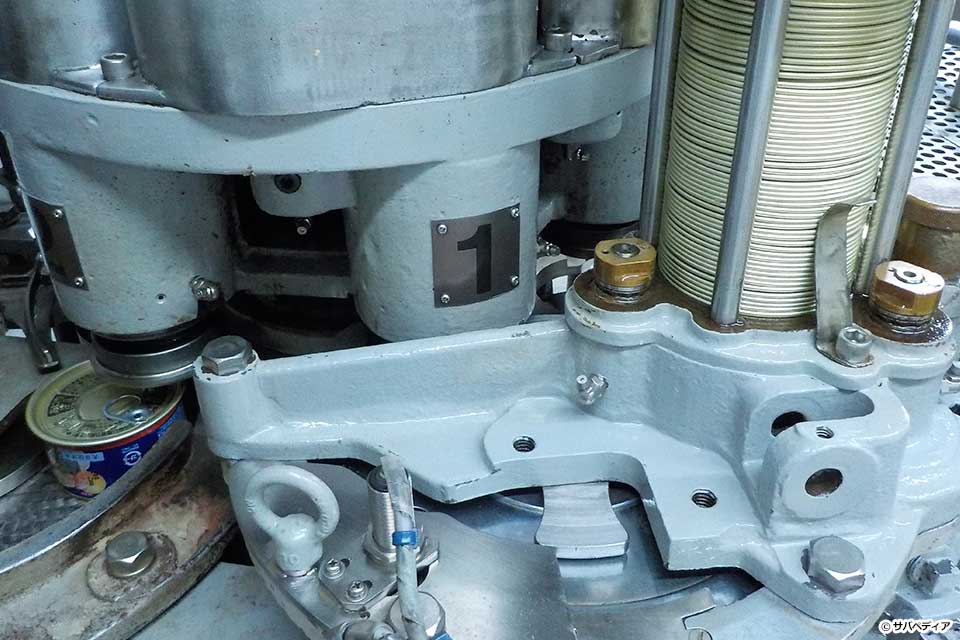 缶の蓋を、機械で閉じていきます。異物や菌が入らないよう、空気を抜いてしっかり密封します。